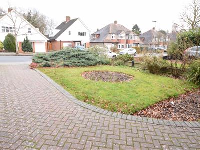 To the front is a generous lawned area and central circular flower bed, and a sizeable block paved driveway accommodating two cars to the front of the house. The driveway goes through wooden gates to the side of the house and towards the detached garage.