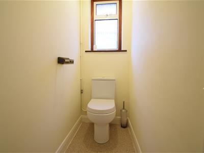 Varnished wood door, neutral colour vinyl flooring, modern low level WC, cream emulsion walls, obscured glass double glazed window, ceiling light fitting.