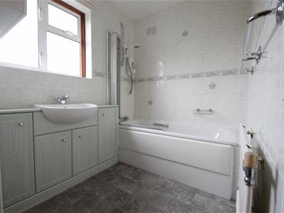 2.90m max x 1.78m (9'6 max x 5'10)Grey tile effect vinyl flooring, fully tiled walls, white bath with chrome mixer tap and a wall mounted electric shower, glass folding shower screen, range of vanity storage cabinets in a washed wood design with integral hand basin, airing cupboard, wall mounted bathroom cabinet with mirrored doors, obscured glass double glazed window, radiator, ceiling light fitting.