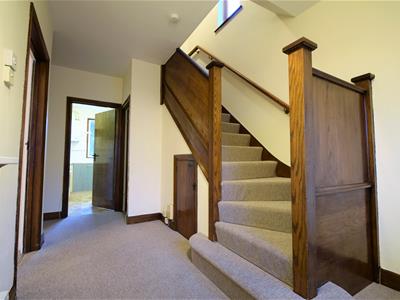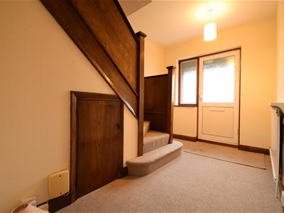 4.47m (14'8)Covered and enclosed front porch with double glazed sliding entry door, exposed brickwork internal walls, teracotta tiled floor, light, gas meter, double glazed front door to entrance hall, neutral carpet, cream emulsion painted walls, varnished skirting and stair woodwork, ceiling light fitting, radiator, under stairs cupboard.