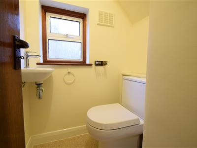 Neutral vinyl flooring, cream emulsion walls, modern low level WC, wall mounted hand basin, obscured glass double glazed window.