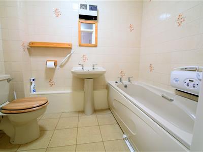 2.34m x 1.70m (7'8 x 5'7)Tiled floor and fully tiled walls, beige colour bathroom suite comprising bath, pedestal wash basin and low level WC, bathroom cabinet with mirrored doors, ceiling light fitting, extractor, electric fan heater.