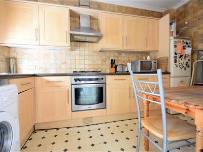 3.76m x 1.98m (12'4 x 6'6)Tile effect vinyl flooring, a range of wood effect shaker style kitchen cabinets with dark colour high gloss worktops, walls mainly tiled with one wall neutral emulsion painted, built in electric oven, gas hob ad stainless steel extractor hood, stainless steel 1/5 bowl sink and drainer unit with mixer tap, spaces for washing machine and full height fridge freezer, double glazed window.