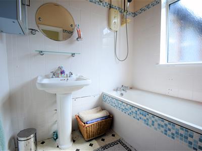 1.88m x 1.70m (6'2 x 5'7)Tile effect vinyl flooring, majority of walls in white tile with blue mosaic high level horizontal border, upper walls emulsion painted, UPVC double glazed window, white bath with electric shower over, pedestal wash basin, ceiling light fitting, small radiator.