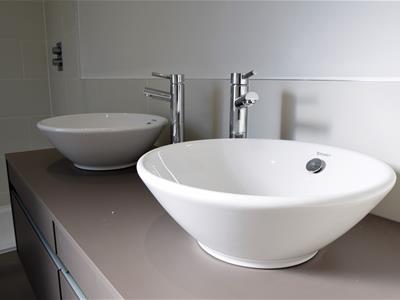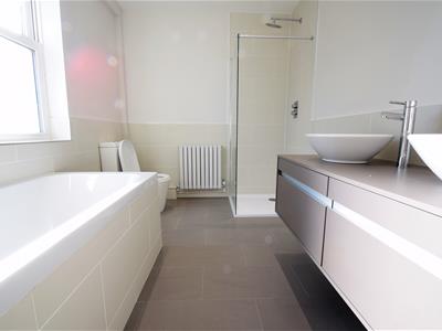 3.20m x 2.26m (10'6 x 7'5)Grey ceramic floor tiles, neutral colour wall tile to part walls with neutral emulsion to remainder, wide grey colour wall mounted vanity unit with drawers and two "his & her" white top mounted bowl wash basins with deck mounted modern chrome mixer taps, large over-sized white bath with wall integrated controls, modern low level WC, walk-in shower enclosure with large glass screen, obscured glass UPVC double glazed window, spot lights, extractor.