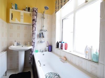2.44m x 1.52m (8'0 x 5'0)white panelled door, tiled flooring, white bath, hand basin & pedestal small radiator, extractor fan, obscured UPVC double glazed window, ceiling light fitting.