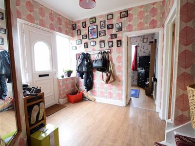 UPVC double glazed front door with double glazed flank windows, wood laminate flooring, wallpapered walls, coving, radiator, ceiling light fitting.