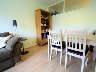 l-shaped: 5.28m max x 3.48m max reducing to 2.54mGlass panelled door, wood laminate flooring, cream wall decoration, large UPVC double glazed windows overlooking communal gardens, two ceiling light fittings, two double radiators.