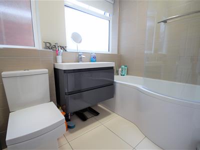 2.26m x 1.78m (7'5 x 5'10)A brand new modern bathroom suite comprising P-shaped bath with curved glass shower screen, a modern high gloss vanity unit with integrated wash basin, modern WC, filly tiled floor, modern neutral colour wall tile, two obscured glass double glazed windows, radiator, ceiling light fitting.