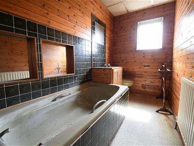 2.97m x 1.52m (9'9 x 5'0)Sliding door, part wood panelled and part tiled walls, carpet, bath, storage cabinet with top mounted sink, WC, louvre window, ceiling light fitting, radiator, suspended ceiling.