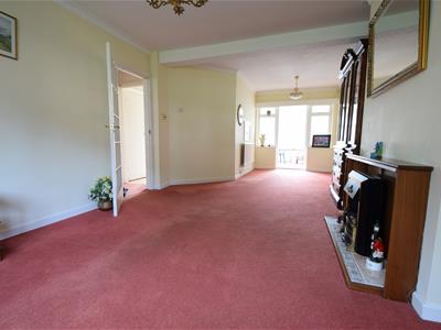 7.80m max x 3.51m max reducing to 2.36m (25'7 maxGlass panelled door, carpeted flooring, neutral decoration, wood fire place surround with electric coal effect fire, leaded single glazed bay window to front with secondary glazing panels, rear door and flank windows to conservatory, two radiators, two ceiling light fittings.