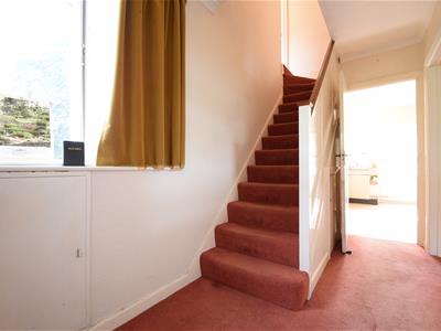 Solid wood panelled front door with high level glass panel, carpeted flooring, single glazed window to side with secondary glazing panel, neutral wall paper, under stairs storage cupboard, low level fuse box cupboard, ceiling light fitting, coving.