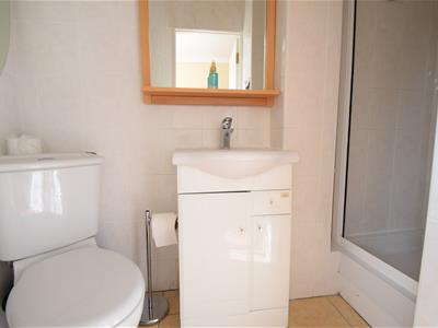White painted door, tiled floor and tiled walls, WC, gloss white vanity cabinet with top mounted was basin, shower enclosure.