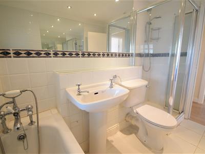 2.79m x 1.78m (9'2 x 5'10)Tiled floor, glass shower enclosure with wall integrated shower mixer, WC, pedestal wash basin, bath with shower mixer tap, chrome heated towel rail, two wall integrated mirrors, white wall tiles, glass block design wall opening providing natural light from kitchen, spot lights, extractor fan.