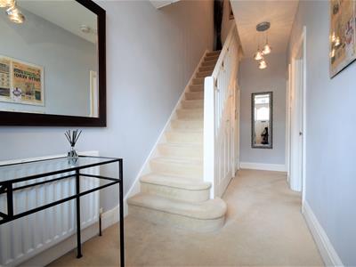Solid wood panelled front door with leaded glass panel, fitted internal door mat, neutral carpet, grey emulsion painted walls, radiator, under stairs cupboard, two ceiling light fittings, double glazed side window.