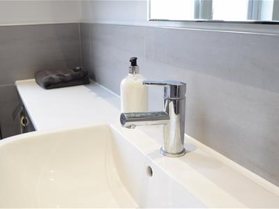 To the first floor are two generous double bedrooms and a good sized third single bedroom, and a breath-taking modern bathroom suite in grey and white colour with high gloss grey vanity cabinets, an oversized bath and separate shower enclosure.