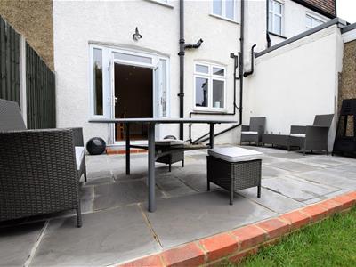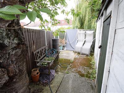 To the rear the West facing garden stretches to approximately 50-60ft, with a modern grey natural stone paved patio with set brick border, main;y laid to lawn with a dividing fence, on the other side of which is a detached garage and a further storage area.