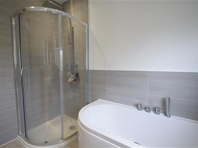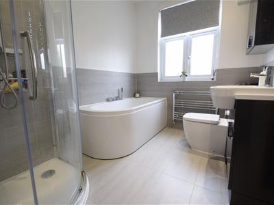 2.57m x 2.11m (8'5 x 6'11)White painted panelled door, grey floor tile and matching grey wall tile to half height, white emulsion painted upper walls, modern gloss grey fronted vanity cabinet with integrated wash basin and concealed cistern WC, oversized modern bath with side mounted controls, separate glass shower enclosure with sliding entry door and chrome shower mixer valve, spot lights, chrome heated towel rail, UPVC double glazed window.