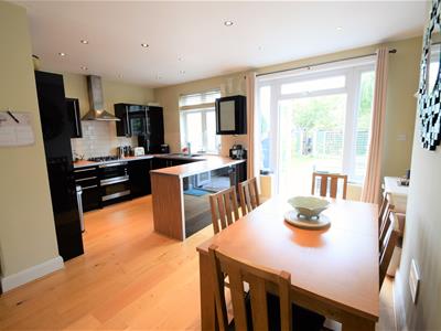 l-shape: 5.49m max recesses x 4.39m max (l-shape:White painted panelled door, wood flooring, neutral emulsion painted walls, spot lights, radiator, modern gloss black fitted kitchen suite with a range of wall and base cabinets and an extended breakfast bar style section, wood effect counter tops, integrated dishwasher, integrated washing machine, built in double oven, gas hob, stainless steel extractor hood, cream splash wall tiling, double glazed window and double glazed French doors to garden,