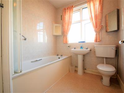 2.67m x 2.01m (8'9 x 6'7)White painted panelled door, vinyl flooring, white bath with shower over and a glass folding shower screen, pedestal wash basin, WC, boiler cupboard housing combination boiler, fully tiled walls, double glazed window, loft access hatch, radiator, ceiling light fitting.