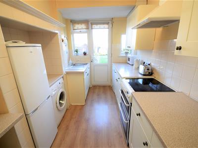 3.84m x 2.06m max (12'7 x 6'9 max)White painted panelled door, cream shaker style kitchen suite with neutral colour counter tops, neutral splash back tiling, UPVC double glazed door and side window, ceiling light fitting, small radiator.