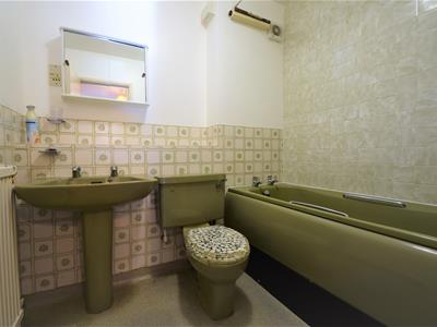 2.11m x 1.70m (6'11 x 5'7)White painted door, vinyl flooring, part tiled walls, green bathroom suite comprising bath, WC and pedestal wash basin, electric shower over bath, radiator, ceiling light fitting, extractor fan.