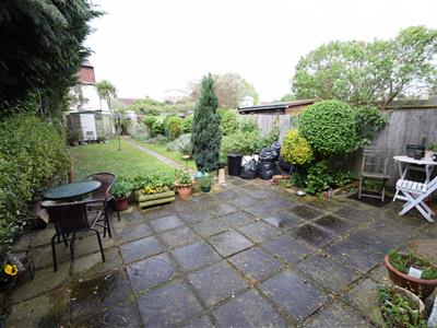 The rear garden stretches to approximately 75-80ft, includes a paved patio, main lawn area, timber storage shed and a detached garage with access via a rear communal access road.