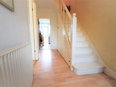 Enclosed entrance porch with double glazed door and side windows, terracotta tiled floor, white painted internal walls, double glazed door into entrance hall, wood laminate flooring, neutral emulsion paint over wallpaper, white painted staircase, ceiling light fitting, coving, double radiator, under stairs cupboard.