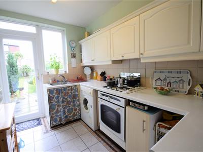 3.18m x 2.03m (10'5 x 6'8)Tiled floor, range of white kitchen cabinets with white laminated worktops, spaces for appliances, built in oven and hob, sink and drainer unit, ceiling light fitting, emulsion painted walls, double glazed door and window to garden.