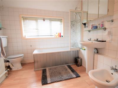 2.36m x 2.31m plus door recess (7'9 x 7'7 plus dooWhite painted panelled door, wood effect laminate flooring, airing cupboard, white tiled walls, white bath with shower over and glass shower screen, WC, pedestal wash basin, bidet, radiator, ceiling light fitting, double glazed window.