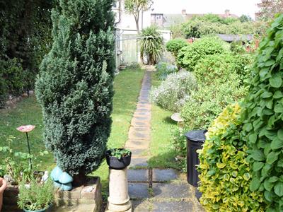 To the front is an enclosed garden with low level walled boundary to front, mature shrubs/hedging, wrought iron gate, pathway to front door.
