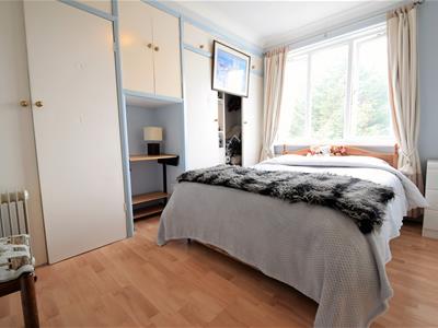 3.68m x 3.10m max into recesses (12'1 x 10'2 max iWhite painted panelled door, wood effect laminate flooring, blue emulsion paint over wall paper, range of built in wardrobes with white painted wood doors, coving, ceiling light fitting, radiator, double glazed windows.