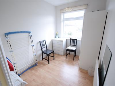 2.87m max x 2.13m (9'5 max x 7'0)White painted panelled door, wood effect laminate flooring, white emulsion over wall paper, double glazed window, ceiling light fitting, radiator.