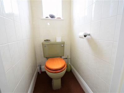 White painted panelled door, carpet tiles to floor, green WC, tiled walls, UPVC double glazed window, ceiling light fitting.