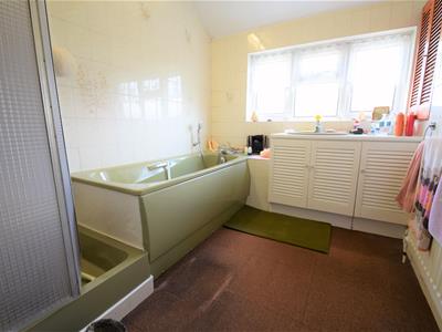 2.77m max x 2.13m (9'1 max x 7'0)White painted panelled door, carpet tiles to floor, green shower tray with folding screen doors, green bath with shower mixer tap, wooden vanity cabinet with louvre doors and a top mounted green wash basin, tiled walls, UPVC double glazed window, radiator, ceiling light fitting, storage cupboard.