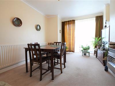 9.60m max bay x 3.66m max, reducing to 3.30m max (Solid wood white painted panelled door, neutral carpet, neutral emulsion over wall paper, two radiators, two ceiling light fittings, two old style gas fires, white aluminium framed double glazed bay window, white aluminium framed double glazed sliding patio doors to garden, coving to ceiling.