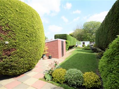 Externally, there is an attractive paved front garden with planting beds and a tall hedged boundary. The rear garden is a beautifully landscaped garden with tall manicured conifer hedging to both sides, stretching to 85ft plus the width of the detached garage to the rear, and with a paved patio and well maintained lawn, together with a brick storage shed.