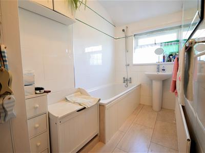 3.23m x 1.45m (10'7 x 4'9)Neutral tile effect laminate flooring, large white wall tiles with green border tile, pedestal wash basin, white bath with shower mixer tap over, built in airing cupboard, UPVC double glazed window, radiator, ceiling light fitting.