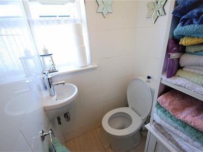 Tile effect laminate flooring, white wall tile with green border tile, UPVC double glazed window, low level WC, small wall mounted wash basin.