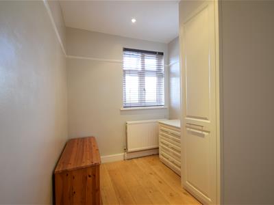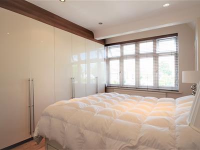 4.39m to wards x 3.35m max into recesses (14'5" toSolid wood panelled door, double glazed window to front bay, double radiator, contemporary fitted wardrobes along one wall, neutral wall papered walls, door to eave's storage, coved ceiling with spotlights, wood floor.