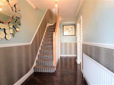 Enclosed entrance porch with double glazed windows and double glazed door, tiled floor, wall light. Solid wood front door with tongue and groove finish and small centrally-aligned leaded glazed panel, double glazed frosted window to porch, radiator, contrasting wall papered walls, dado rail, telephone point, coved ceiling with light, thermostat control, wood panelled door to coat cupboard, door to under-stairs cupboard. Contemporary striped stair carpet.