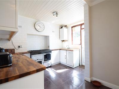 3.18m x 2.51m max into recesses (10'5" x 8'3 max iDouble glazed window to rear with extractor fan, double glazed door leading to garden, range of whit Shaker style fitted wall and base units, space for range cooker, single stainless steel sink unit with mixer tap, wood worktops, space and plumbing for dishwasher, washing machine and tumble dryer, wall mounted Vokera boiler. Metropolitan tiled walls, wall lights, panelled ceiling with light. Opening to: