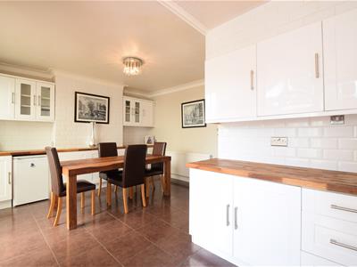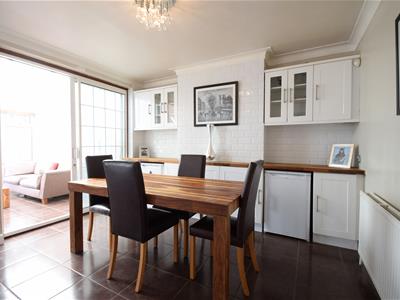 3.68m x 3.33m max into recesses (12'1" x 10'11" maSolid wood panelled door, double glazed sliding patio doors to conservatory, range of white Shaker style fitted wall and base units to chimney breast wall, feature wall with Metropolitan tiles, double radiator space for fridge and freezer, coved ceiling, ceiling light, tiled floor. Opening to kitchen.