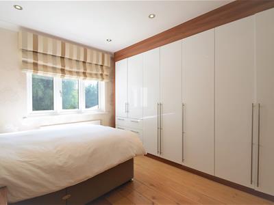 2.69m x 2.11m max (8'10" x 6'11" max)Solid wood panelled door, double glazed upVC window to front, double radiator, contemporary fitted wardrobes to two walls with matching fitted drawer unit, picture rail, air vent, ceiling spotlights, air vent.