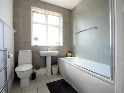 2.64m x 2.03m (8'8" x 6'8")uPVC frosted double glazed window to rear, white enamel bathroom suite comprising: low level w.c., pedestal wash hand basin with chrome mixer tap, bath with mixer tap and shower attachment, glass shower screen, grey stone effect tiled walls, painted panelled wall, chrome heated towel rail, airing cupboard with shelving, stone effect tiled floor, ceiling light fitting.