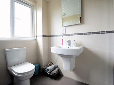 2.62m x 1.55m max (8'7" x 5'1" max)Solid wood painted panelled door, uPVC double glazed frosted window to rear, white low level w.c., wall mounted white wash hand basin, enclosed shower cubicle with integral rainfall shower head and separate additional shower head, wall mounted vanity mirror with feature lighting, chrome heated ladder style towel rail, part tiled neutral walls, grey ceramic tiled floor, extractor fan, ceiling light fitting.