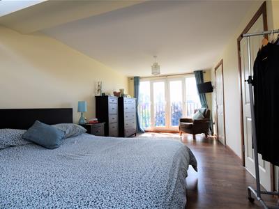 6.17m max into eaves x 3.99m into recess (20'3" maSolid wood panelled door, uPVC double glazed doors to rear, Juliet balcony, 2 double glazed Velux windows with integrated blackout blinds to front, double radiator, 2 doors to eaves storage, wood effect laminate floor, solid wood painted panelled door to en-suite shower room, ceiling light fitting.