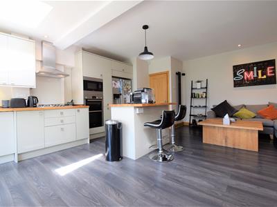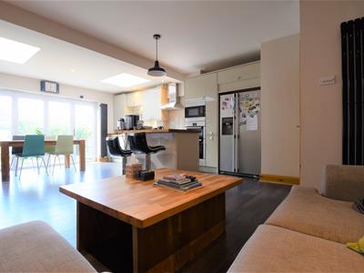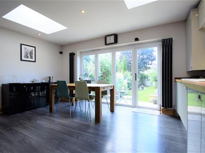 6.93m max x 5.13m max (22'9 max x 16'10 max)Solid wood panelled door, neutral emulsion painted walls, white uPVC double glazed bi-fold doors overlooking garden, range of putty coloured contemporary kitchen wall and base units, white enamel Butler style sink with drainer and chrome mixer tap, glass splash-back, spotlight over sink, cupboard housing 'Main' Combi 30 HE boiler, Bosch double oven and Lamona integrated microwave, space for American fridge/freezer, 4 ring stainless steel gas hob with glass splash-back, stainless steel extractor hood with lights, space and plumbing for washing machine, integrated dishwasher, 3 contemporary tall black vertical radiators, island unit with storage and power points, wood butcher block style worktops, pendant light over island, spotlights, 2 Velux skylights, grey wood grain effect laminate flooring,