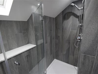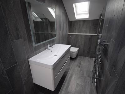3.28m x 1.22m plus shower recess (10'9 x 4'0 plusWhite painted door, dark grey floor and wall tiles, shower recess with bespoke glass entry door, wall mounted shower controls, large white gloss wall mounted vanity cabinet with 2 drawers and integrated large wash basin, concealed cistern WC, fitted and heated "anti-mist"wall mirror, modern chrome heated towel rail, spot lights to ceiling, extractor fan, under floor heating, double glazed velux window.