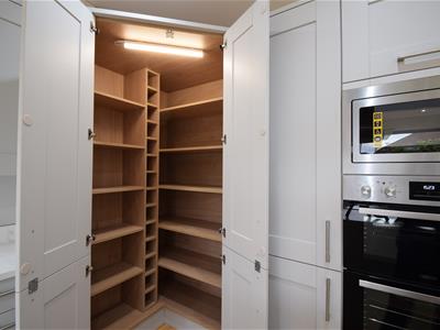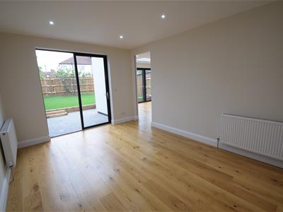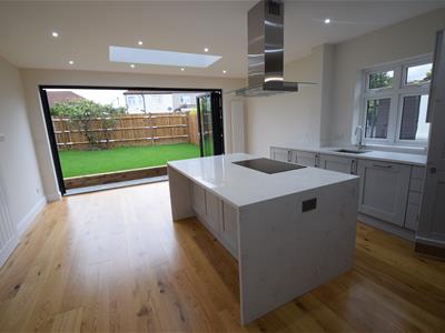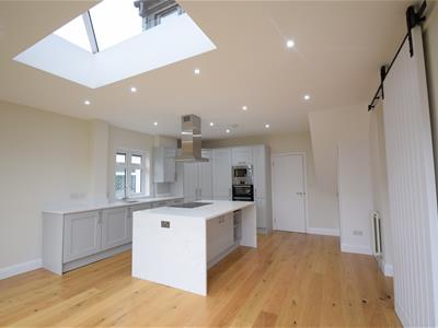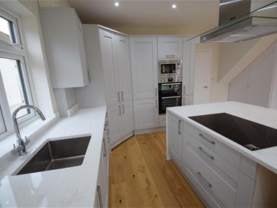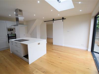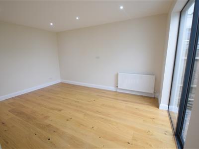 5.94m x 4.88m (19'6 x 16'0)Real wood engineered flooring, neutral emulsion decoration, beautiful grey colour fully integrated kitchen suite with white/grey stone counter tops and a large water fall matching stone counter top, high level integrated double oven and microwave, large induction hob, integrated fridge freezer, integrated washing machine and integrated dishwasher, double glazed window and double glazed large bi-folding doors to garden, spot lights to ceiling, radiator, large sliding door to: